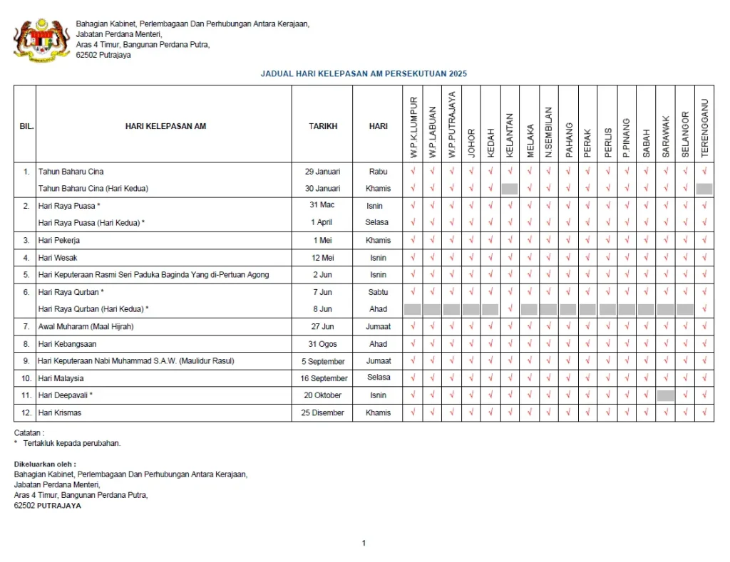 Bagi memudahkan perancangan, anda boleh merujuk kepada jadual hari kelepasan am peringkat Persekutuan dan Negeri untuk tahun 2025 melalui portal rasmi KPM: